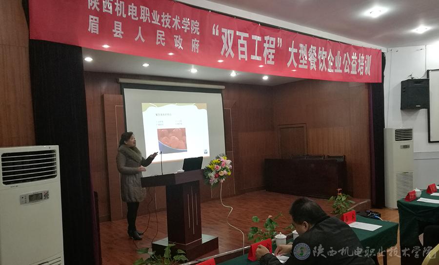 2018年1月2日,在眉县文物旅游局、教体局、太白山管委会综合局的支持下,在县职教中心、餐饮饭店协会协作下,由陕西机电职院参与承办的“双百工程”眉县产学研一体化大型餐饮公益培训第一期在太白酒业宾馆顺利举行。共有来自13个单位的51名学员参加培训。我院工会副主席李明参加了本次培训班的开班仪式,并代表学院发表了讲话,眉县餐饮协会书记杨小勇出席开班仪式并向培训班学员提出了培训要求。