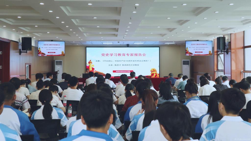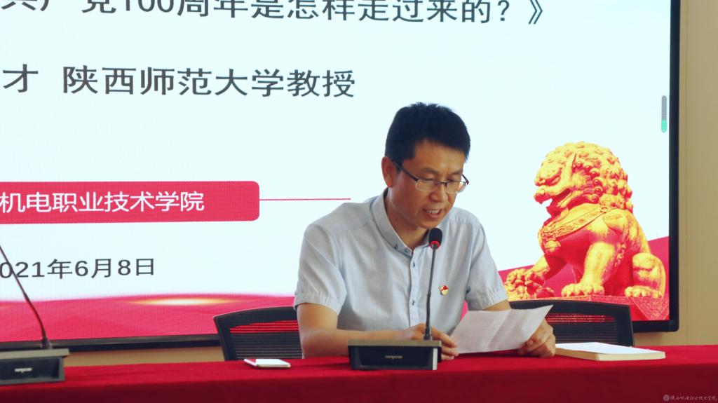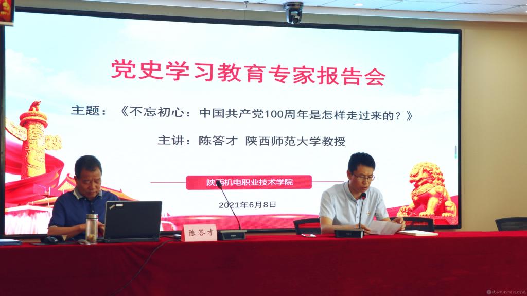 根据《中共陕西省委教育工委陕西省教育厅开展党史学习教育专题宣讲工作方案》的通知要求,结合我校党史学习教育工作安排。6月8日下午,陕西师范大学陈答才教授在我校宝福路校区汽车机电大楼(四楼)视频会议室进行题为《不忘初心:中国共产党100周年是怎样走过来的?》党史学习教育专题讲座。讲座由党委宣传部部长李明主持。