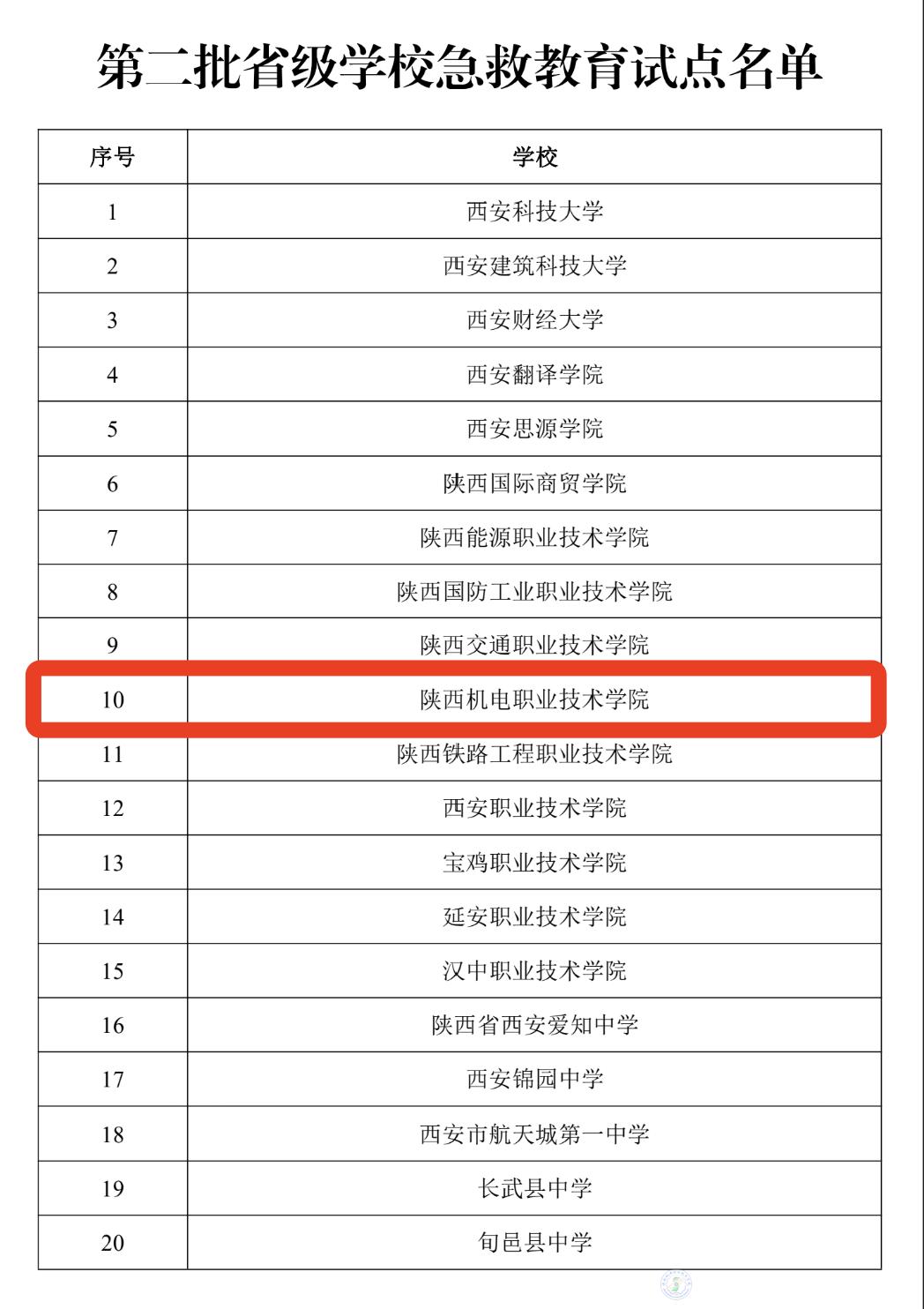 热烈祝贺陕西机电职业技术学院入选第二批省级学校急救教育试点单位