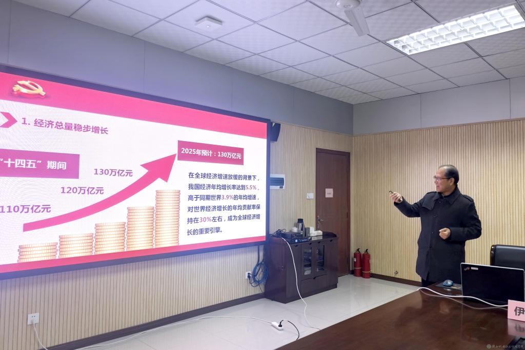 为深入贯彻落实党的二十届四中全会精神,12月11日下午,党委书记伊逊智在蟠龙校区图书馆二楼会议室作党的二十届四中全会专题辅导,校领导、处级干部参加报告会。